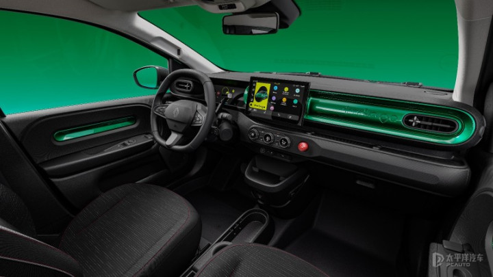 内饰设计以令人愉悦的风格呈现,色彩鲜艳,并多处运用了胶囊造型的设计元素。新车采用7英寸全液晶仪表盘与10英寸中控屏相结合的内饰布局,其中中控屏安装在与车身同色的副驾仪表台饰板上,营造出悬浮的视觉效果。中控屏不仅集成了丰富的多媒体和车联网功能,还搭载了名为Reno的车载语音助手。该系统基于ChatGPT-4o-mini大模型开发,在支持语音控车的同时,还能解答用户提出的各类常识性问题。